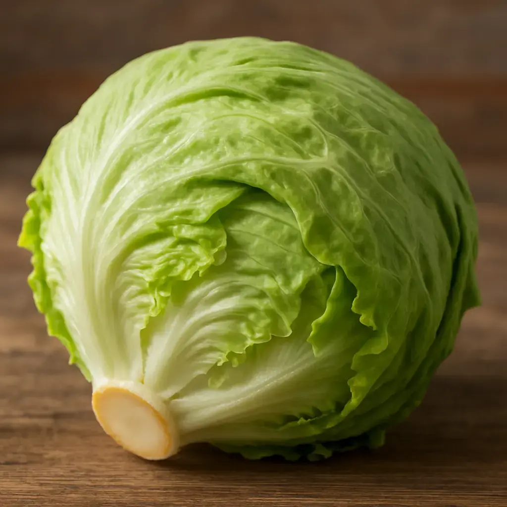 Iceberg lettuce is a crisp, mild-flavored leafy green often used in salads and sandwiches.